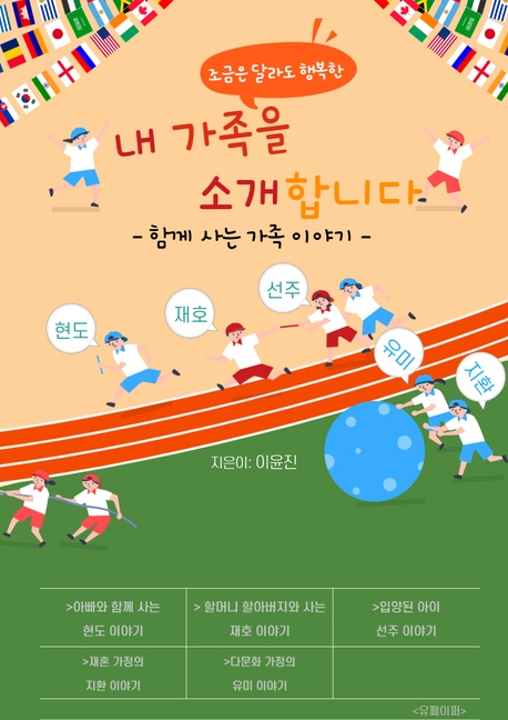 책 속에는 다섯 명의 친구들이 주인공으로 등장해 각각의 이야기를 들려준다. ‘아빠와 둘이 사는 현도, 할머니 · 할아버지와 함께 사는 재호, 어릴 때 입양된 선주, 부모님이 재혼한 지환, 필리핀인 엄마를 둔 유미’가 바로 그들이다. 이야기 속의 가족들이 서로를 의지하고 다독이며 살아가는 모습은 세상 어느 가족보다 따뜻하고 사랑이 넘친다.
