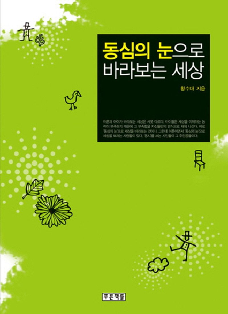 2007년 제5회 푸른문학상 ‘새로운 평론가상’을 수상하며 본격적인 평론가의 길을 걷기 시작한 황수대 평론가가 그동안 써 온 동시 비평들만을 모아 펴낸 평론집 『동심의 눈으로 바라보는 세상』은 그래서 큰 의미와 가치를 지닌다. 현재 우리 동시는 양적인 풍요를 맞고 있지만 이것이 더 나은 질적 향상으로 이어지기 위해서는 비평의 역할이 무엇보다 중요하다. 이 평론집은 우리 동시에 대한 무한한 애정을 바탕으로 한 냉철한 고찰과 전문적인 연구, 분석을 통해 우리 동시가 걸어온 길을 되짚어 보고 현재 서 있는 자리와 성과를 확인하며 앞으로 걸어가야 할 길을 제시하고 있다.