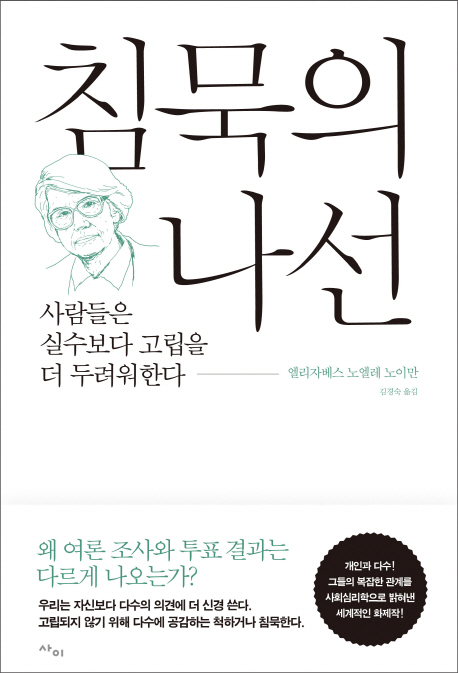 “사람들은 자신의 의견이 사회적으로 우세하고 다수 의견에 속하면 자신 있게 목소리를 내고, 소수 의견에 속하면 침묵한다.”는 이론이 바로 〈침묵의 나선 이론Spiral of Silence Theory〉이다. 1965년 서독 총선에서 선거 전 여론조사와 실제 투표 결과가 반대로 나오는 현상을 목격한 이 책의 저자 엘리자베스 노엘레 노이만은 이러한 현상이 계속해서 반복되는 것을 직접 목격하면서 그 원인을 찾는 과정에서 침묵의 나선 현상을 포착했고, 그러한 현상이 나타나는 이유는 다름 아닌 개인이 느끼는 〈고립에 대한 두려움〉 때문이라고 지적했다. 이 고립의 두려움은 모든 인간이 갖고 있는 〈사회적 본성〉인데, 우리는 이 본성을 부정하거나 인정하지 않으려는 경향이 있지만 이는 실제로 우리 행동에 많은 영향을 끼친다.