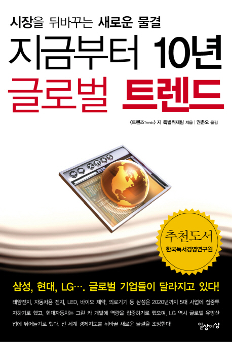 급변하는 세상에서 글로벌 기업들은 10년 후를 내다보며 새로운 사업영역을 개척해나가고 있다. 태양전지, 자동차용 전지, LED, 바이오 제약, 의료기기 등 삼성은 2020년까지 5대 사업에 집중투자하기로 했고, 현대자동차는 그린 카 개발에 역량을 집중하기로 했으며, LG는 태양전지, 차세대 조명, 차세대 전지 등 글로벌 유망산업에 뛰어들기로 했다. 최신 정보를 얼마나 빨리 받아들이느냐에 따라 기업과 개인의 미래가 달라지는데, 이 책은 지금부터 10년 후까지의 지구촌을 거시적?미시적으로 조망하고 있다. 이 책에는 클라우드 컴퓨팅, 응답 엔진, 인공생명, e사이클링, 연료전지, 핵융합발전 등 최근 뜨거운 감자로 떠오른 신기술들이 지금부터 10년 후까지 어떻게 발전해나갈지, 그에 따른 기회와 위기는 무엇인지를 밝히고 있다. 이 책을 읽으면 오늘의 현주소를 이해하고, 앞으로 어떤 트렌드가 세상을 뒤흔들 것인지, 우리가 무엇에 관심을 가져야 하는지를 깨닫게 될 것이다.