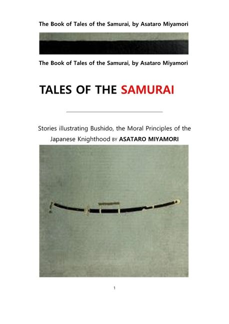 일본 봉건시대의 무사 사무라이 이야기.The Book of Tales of the Samurai, by Asataro Miyamori일본대학교의 영어교수TALES OF THESAMURAI________________________________________Stories illustrating Bushido, the Moral Principles of the Japanese KnighthoodBYASATARO MIYAMORIPROFESSOR OF ENGLISH IN TOYO UNIVERSITY,TOKYO, JAPANAUTHOR OF “REPRESENTATIVE TALES OF JAPAN,”“TALES FROM OLD JAPANESE DRAMAS,” &C.With 8 Coloured IllustrationsBy A Japanese ArtistTHE KY?-BUN-KWANGinza, Tokyo, Japan1920