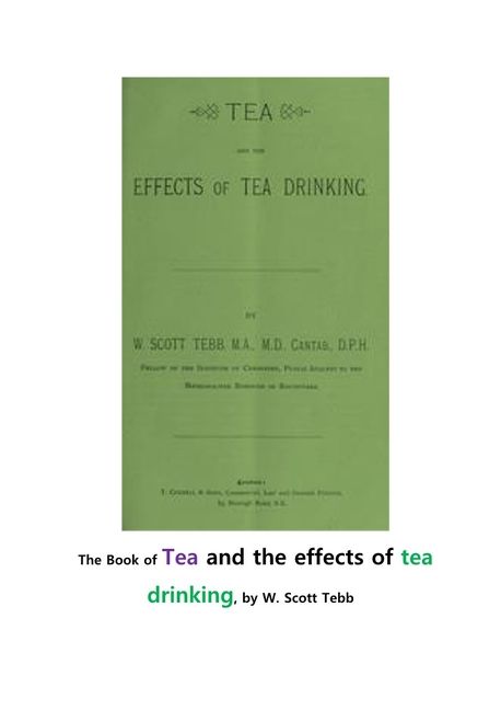 W. Scott Tebb 차와 차 마시기 효과.The Book of Tea and the effects of tea drinking, by W. Scott Tebb영국의 의사가 차와 차마시기의 효과에 대해서 쓴 책으로 차의 설명과 중후반부에 차마시기의 효과를 a- i 까지의 표로 설명함.TEAAND THEEFFECTS OF TEA DRINKING.________________________________________BYW. SCOTT TEBB, M.A., M.D., CANTAB., D.P.H.FELLOW OF THE INSTITUTE OF CHEMISTRY, PUBLIC ANALYST TO THEMETROPOLITAN BOROUGH OF SOUTHWARK.________________________________________London:T. CORNELL & SONS, Commercial, Law and General Printers,63, Borough Road, S.E.