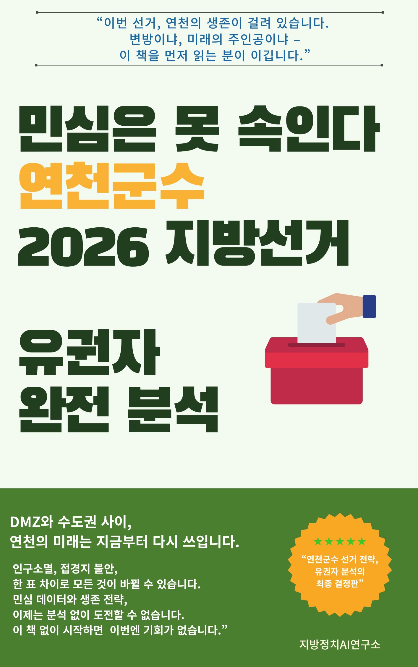 연천군은 DMZ와 군사시설에 둘러싸여 70년간 ‘희생’과 ‘규제’를 감내해 왔다. 이번 선거에서 주민들이 요구하는 것은 세 가지다. 첫째, 전곡읍·연천읍·북부 면 등 권역별 맞춤 개발 공약으로 생활 격차를 해소할 것. 둘째, 청년 일자리와 노년 복지를 동시에 해결하는 세대융합 전략으로 인구 감소 위기를 돌파할 것. 셋째, 군사훈련 소음·안전 문제를 국방부와 협상해 실질 보상을 확대하고 야간 훈련을 제한할 것. 책은 통계청·중앙선관위·언론 보도와 자체 여론조사를 결합해 권역·세대별 표심 변수를 수치로 제시하고, 투표율·표 분산·빅데이터 트렌드에 따른 세 가지 시나리오별 승리 조건을 계산한다. 이어 ‘희생에 보답하고 미래를 연다’는 통합 슬로건 아래 캠페인 메시지·유세 동선·온라인‑오프라인 홍보 채널을 체크리스트로 정리하며, 네거티브 대응 및 투표일 동원 계획까지 완비된 필승 로드맵을 제공한다. 결론은 분명하다. 민심은 속일 수 없으며, 데이터를 읽고 현장을 뛰는 자만이 그 뜻을 얻는다.