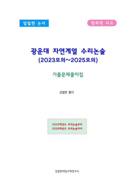 또한 필요한 부분에 대한 부연적인 설명과 다양한 풀이법을 소개함으로써 광운대 자연계열 수리논술에 필요한 수학적 사고력의 지평을 넓혀주는 책이다.