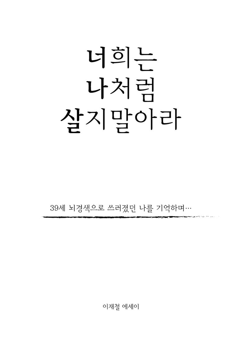 ‘너희는 나처럼 살지말아라’는 평범한 직장인이자 한 가정의 가장이었던 저자가 39세라는 젊은 나이에 갑작스러운 뇌경색으로 쓰러지고, 죽음의 문턱에서부터 다시 삶을 붙잡기까지의 기록을 담은 책입니다. 저자는 의료인이 아니면서도 의료 데이터로만 환자를 바라보는 의사들의 한계를 지적하며, 환자와 가족만이 체감하는 고통과 회복의 여정을 진솔하게 풀어냅니다.