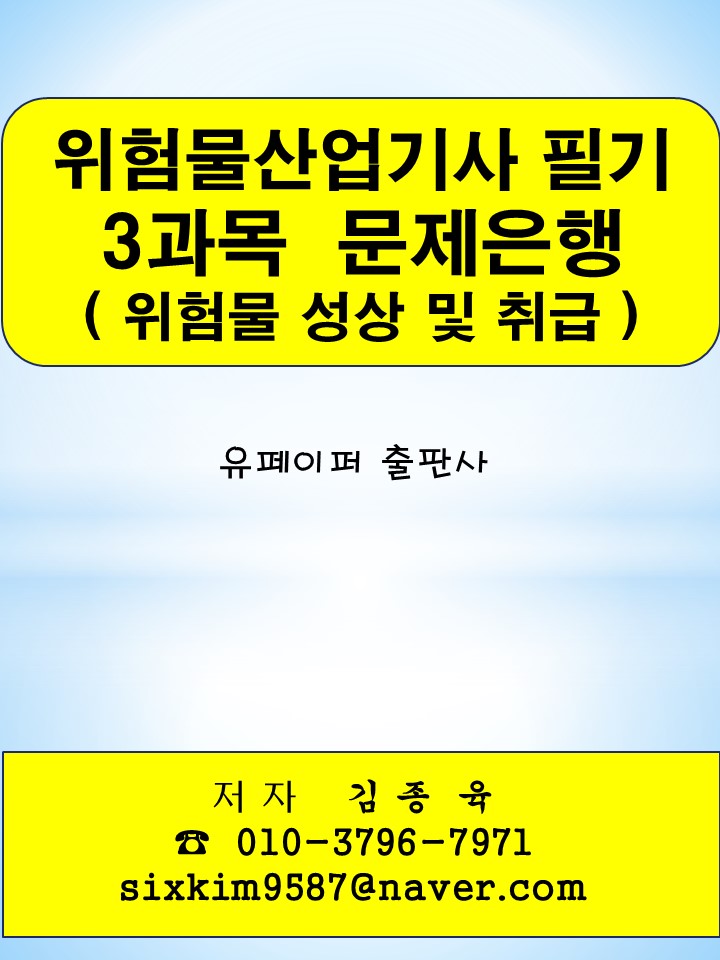 "위험물산업기사 필기 3과목(위험물 성상 및 취급) 문제은행"은 저자가 수험생 입장에서 단기간에 문제를 풀고, 합격에 도움이 될 수 있도록 구성된 문제은행식 저서입니다.