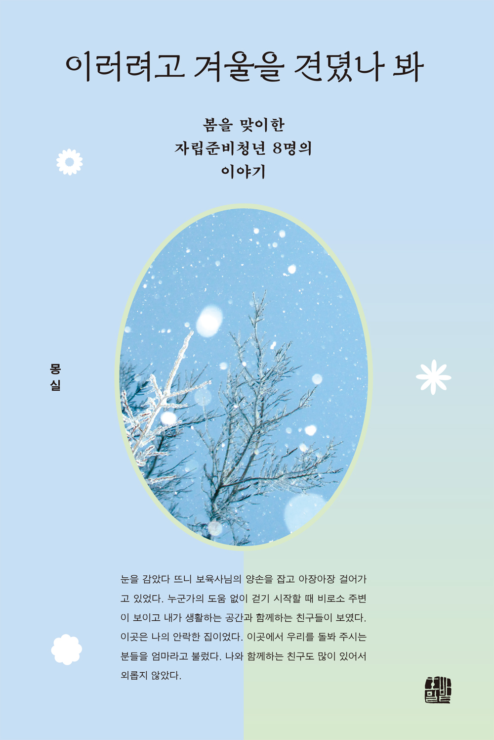 8명의 저자는 혹독한 사회를 견디다가, 명절이 되면 오갈 데 없는 서로를 위로하자며 모였다. 그렇게 ‘몽실’이라는 봉사 단체가 설립되었다. 과거의 자신과 같은 상황에 놓인 자립준비청년이 열매를 맺을 수 있도록 돕자는 취지였다. 이정표는 될 수 없어도, 울타리가 되어 주겠다며 기꺼이 발 벗고 나섰다. 저자는 말한다. “세상에 존재하는 사랑은 메마르지 않고 퍼져 나간다”라고.