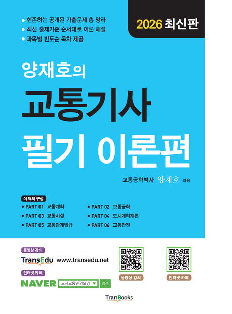 트랜스에듀 교통기사 동영상강의를 통해 대한민국 유일의 양재호 박사 저자 직강 강의를 수강하실 수 있습니다. 동영상강의는 본 교재를 기초로 하여 촬영된 것이므로 전체적으로 강의를 수강한 후 학습을 진행하시면 획기적으로 빠르고 쉽게 자격증을 취득하실 수 있을 것입니다. http://transedu.net