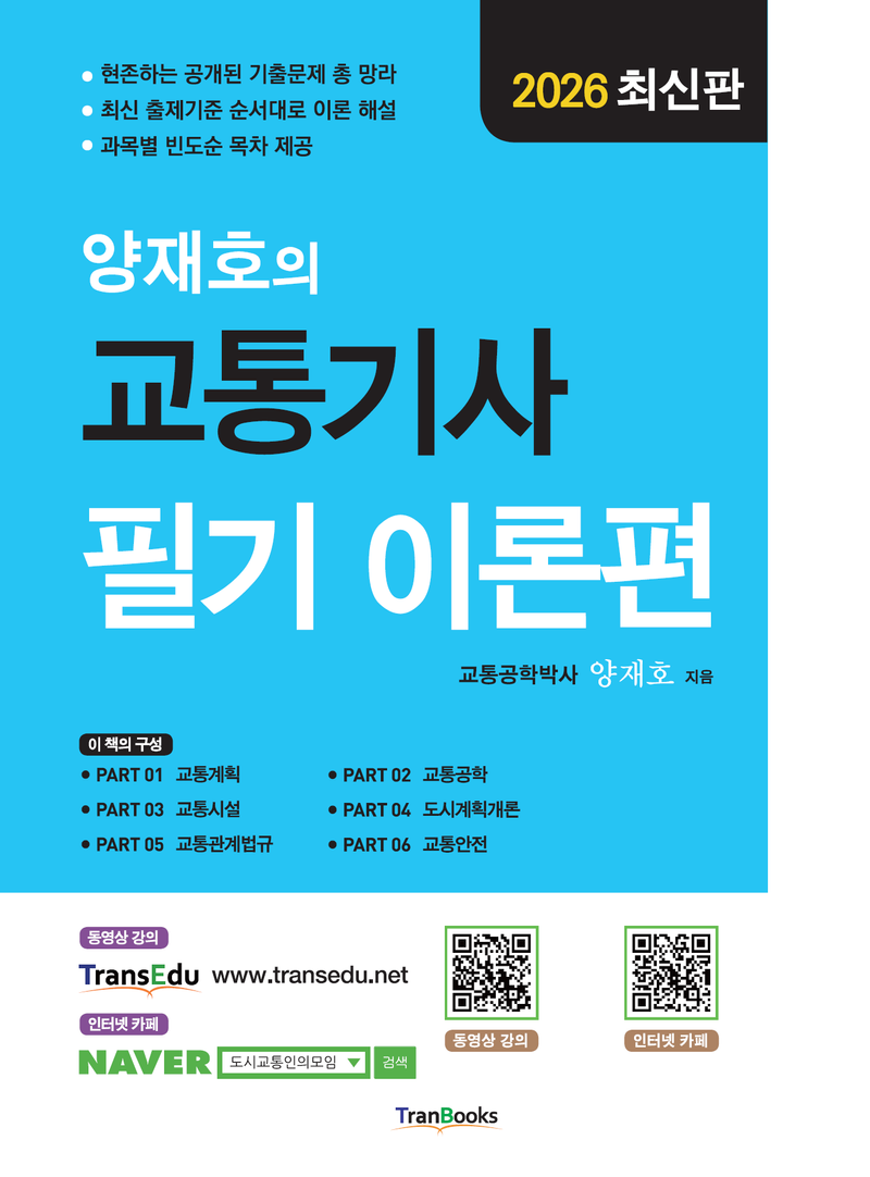 네이버 카페 “도시교통인의모임”에서 교재의 최신 정오표도 올려드리고 소통하고 있습니다. 회원님께서 궁금한 문제를 올리시거나 문의글을 쓰시면 저자인 양재호 박사를 비롯한 기존 회원간 질의 응답 및 토의가 실시간으로 진행됩니다. 학습에 큰 도움이 되시리라 믿습니다. 기사 학습 뿐만아니라 각종 취업에 관련된 정보들도 공유되고 있으니 꼭 가입하셔서 활동해보시기를 추천합니다. https://cafe.naver.com/trafficengineer