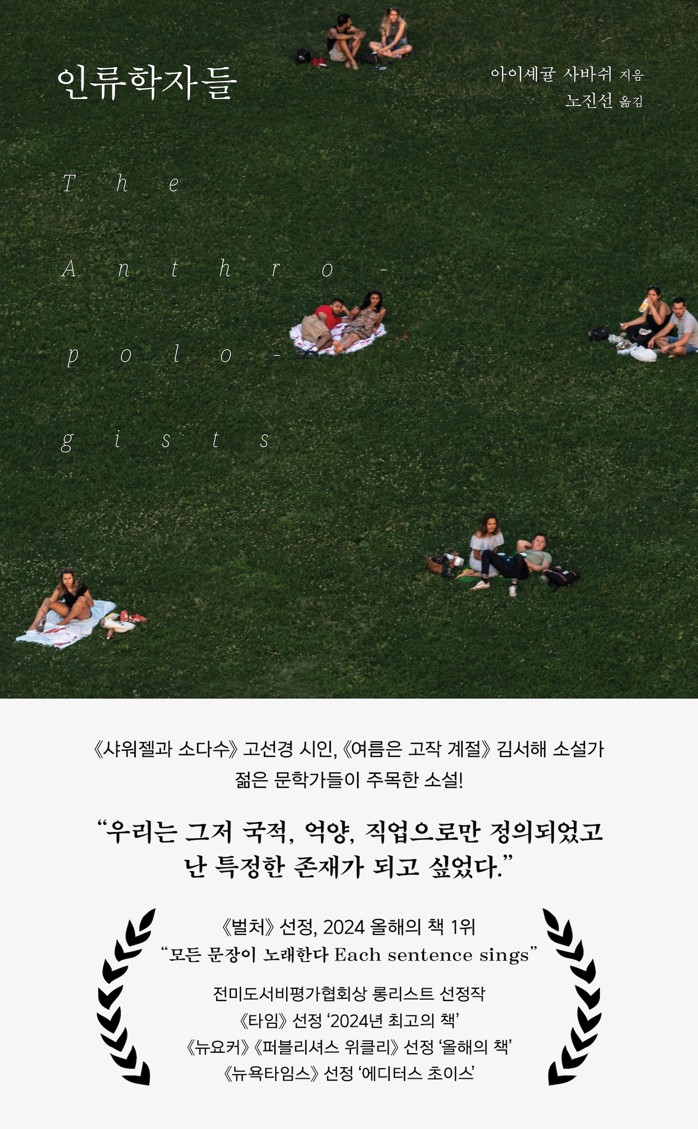 저: 아이셰귤 사바쉬튀르키예 출생으로 미국에서 인류학과 사회학을 전공하고 문예창작으로 석사 학위를 취득했다. 2019년에 《Walking on the Ceiling》으로 평단의 찬사를 받으며 데뷔했다. 2024년 발표한 《인류학자들 The Anthropologists》로 ‘평범한 순간이 가지는 무한한 가능성과 의미’를 보여주었다는 평을 들으며 대중적으로도 널리 알려졌다. 단숨에 전미도서비평가협회상 롱리스트에 오른 이 소설은 《벌처》에서 ‘올해의 책 1위’로 꼽았으며, 《타임》 선정 ‘2024년 최고의 책’, 《뉴요커》 《퍼블리셔스 위클리》 선정 ‘올해의 책’, 《뉴욕타임스》 선정 ‘에디터스 초이스’에 올랐다. 할리우드 배우 다코타 존슨이 티타임 북클럽 도서로 선정하고 특히 버락 오바마가 ‘올해의 책’으로 언급하여 크게 주목받았다. 현재 파리에서 남편과 딸과 함께 살고 있으며 영어로 소설과 에세이를 발표하고 있다./역: 노진선숙명여자대학교 영어영문학과를 졸업하고 소설 창작 과정을 공부했다. 잡지사 기자 생활을 거쳐 전문번역가로 활동하고 있다. 메트 헤이그의 《미드나잇 라이브러리》 《라이프 임파서블》, 피터 스완슨의 《죽여 마땅한 사람들》 《여덟 건의 완벽한 살인》, 요 네스뵈의 《스노우맨》 《리디머》, 할런 코벤의 《아이 윌 파인드 유》, 샐리 페이지의 《이야기를 지키는 여자》, 니타 프로스의 《메이드》, 캐서린 아이작의 《유 미 에브리싱》, 엘리자버트 길버트의 《먹고 기도하고 사랑하라》 등 다수의 책을 우리말로 옮겼다.