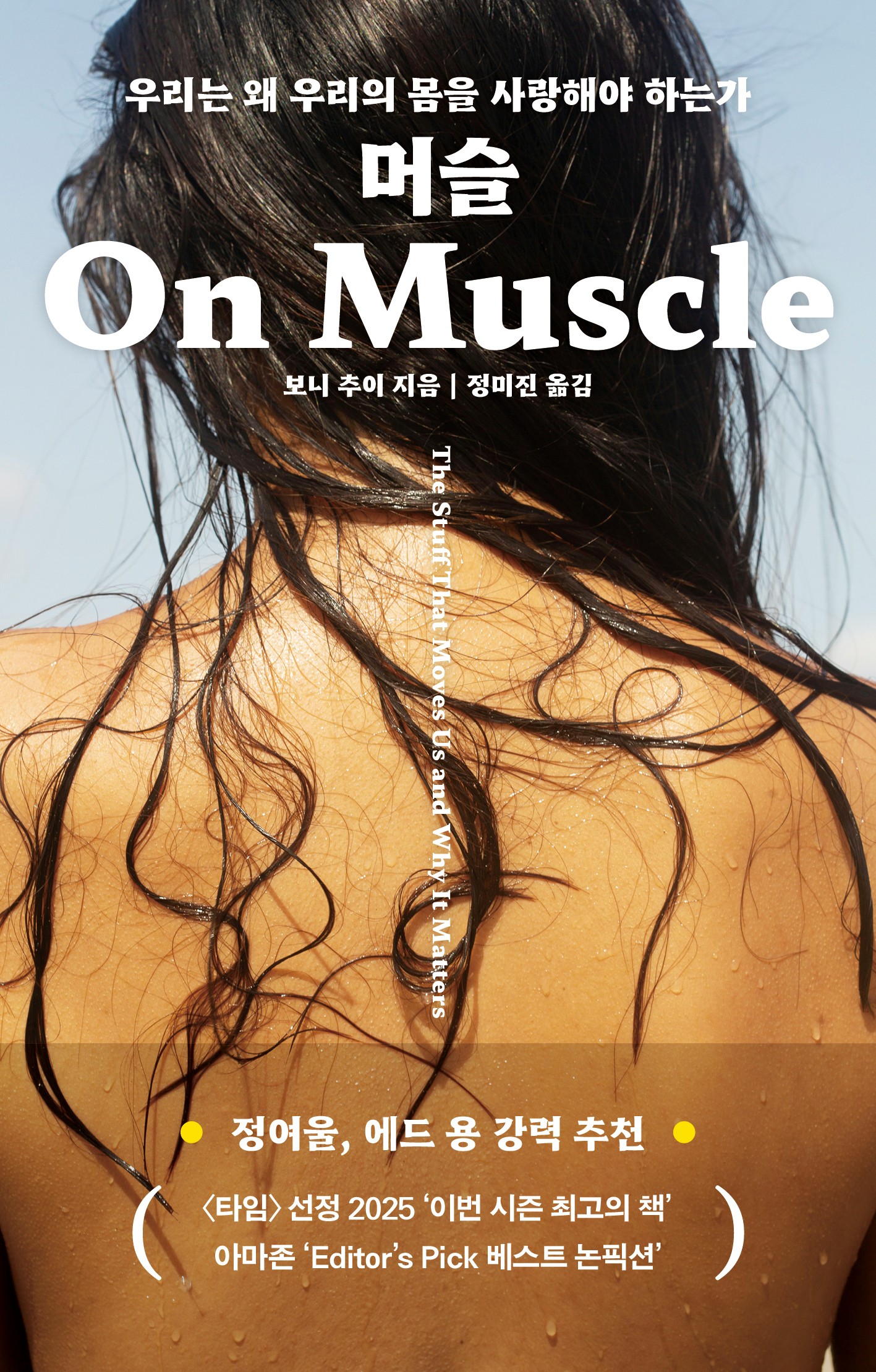 《머슬》은 홍콩계 미국인 작가이자 (근육을 많이 사용해야 하는) 수영 선수이며 서퍼인 저자가 우리 인체의 아주 중요한 기관인 근육을 심층적이고도 통합적인 시선으로 탐구한 논픽션 작품이다. 해부학 교과서도, 운동 안내서도 아닌 이 책은 근육이 지닌 효용과 그것이 지닌 다양한 의미를 조망하기 위해 신선한 방식의 접근법을 채택한다. 바로 근육과 관련된 일을 하는 세계 각지의 사람들을 만나 때로는 해부학 실습에 참가하거나, 때로는 그들과 함께 달리기 또는 줄넘기를 하면서 그들의 삶을 인터뷰해 저자만의 관점으로 엮어낸 것이다.