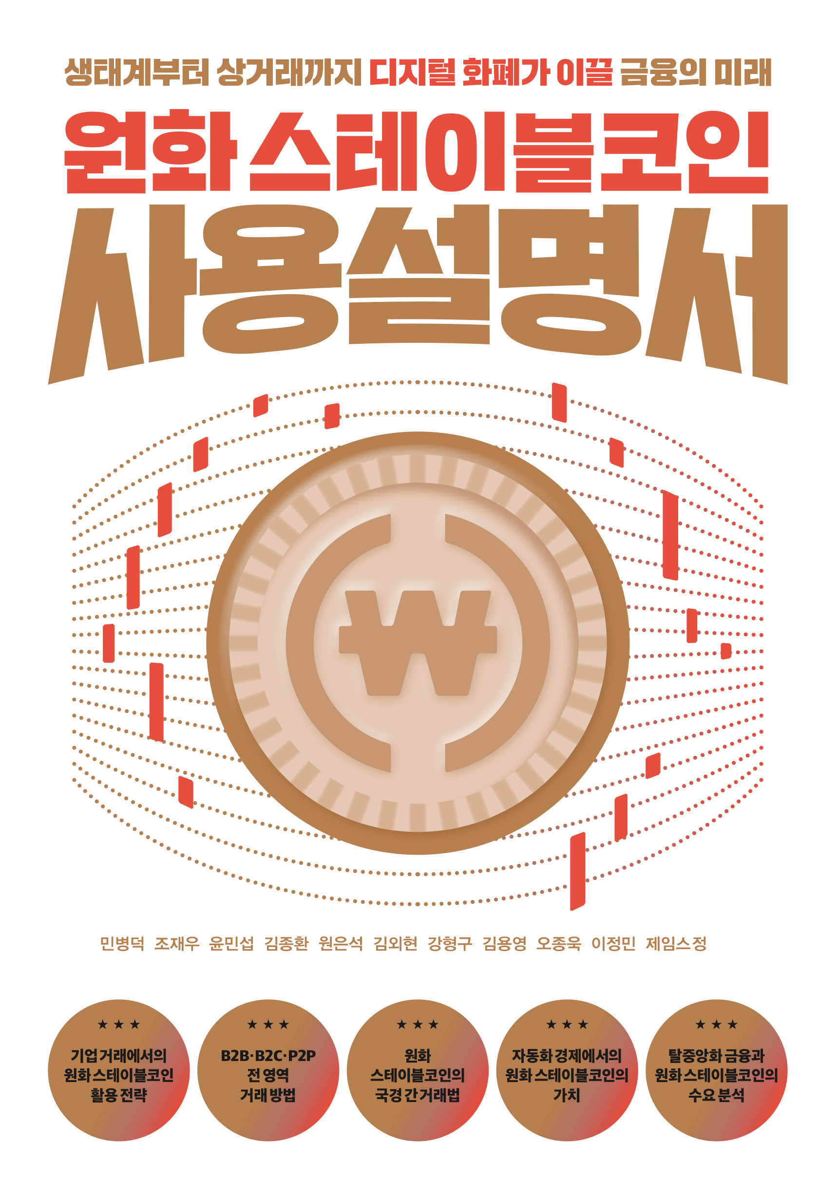 1장 「스테이블코인이란?」에서는 ‘안정적인 코인’을 의미하는 스테이블코인이 가격이 오르지도 않는데 각광받는 이유 등을 한성대학교 사회과학부 조재우 교수가 안내한다. 2장 「글로벌 법과 제도, 그리고 한국」은 윤민섭 디지털소비자연구원 이사가 ‘디지털자산’과 스테이블코인 제도의 변화 과정을 짚어본다. 3장 「원화 스테이블코인이 주는 이익, 기업이 도입해야 하는 이유」에서는 스테이블코인을 기업 내부 거래에 활용할 때 어떤 변화가 있는지 테라-루나 사태를 예측한 것으로 잘 알려진 김종환 블로코 상임고문이 알려준다. 4장 「스테이블코인, 기업과 개인이 사용하는 새로운 결제 인프라」 파트는 원은석 목원대학교 문화콘텐츠대학 교수 주도로 스테이블코인이 각종 사업에서의 스테이블코인의 역할을 짚어본다. 5장 「스테이블코인과 글로벌 경제」는 김외현 〈비인크립토〉 동아시아 편집장이 ‘원화 스테이블코인’이 어떻게 한국 경제의 글로벌 경쟁력을 강화할 수 있는지 구체적인 사례와 함께 살펴본다. 6장 「원화 스테이블코인과 머신 대 머신 경제」에서는 AI와 연결된 인터넷 환경에서의 스테이블코인의 중요성과 AI 간 가치 이동 방식에 대해 강형구 한양대학교 경영학과 교수가 안내한다. 7장 「탈중앙화 금융(DeFi)을 위한 필수 관문」은 엠블록컴퍼니 김용영 CSO가 원화 기반 탈중앙화 생태계의 잠재력과 리스크를 이해하는 방안을 소개한다. 8장 「원화 스테이블코인이 직면한 한계와 그 너머의 길」에서는 스테이블코인이 극복해야 할 과제를 오종욱 웨이브리지 대표와 함께 살펴본다. 9장 「 대중의 신뢰를 얻기 위한 조건」은 이정민 한국금융소비자보호재단 연구위원이 기존 스테이블코인 사용자의 피해 사례를 살펴보고 소비자 보호 전략을 논의한다.