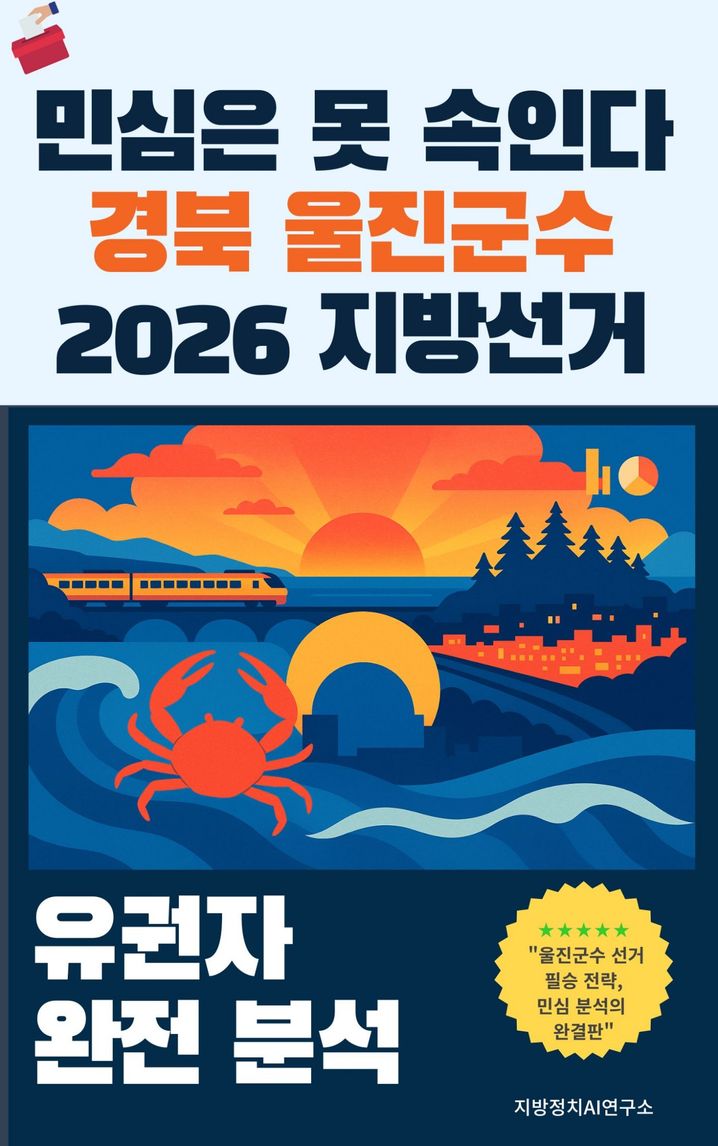 울진은 한울원전을 중심으로 한 에너지 산업, 후포 붉은대게와 연안어업이 이끄는 수산업, 덕구온천과 금강송 숲, 동해 해안 경관을 축으로 한 관광 산업이 삼각형처럼 맞물려 돌아가는 지역이다. 이 삼각축이 만들어내는 일자리와 세수, 생활 패턴은 권역마다 전혀 다른 유권자 지도를 그려낸다. 북면과 죽변에서는 원전 안전과 상생 기금의 사용 방식, 신한울 3·4호기 공사 재개에 따른 지역 업체 참여 비율이 곧 표심의 핵심 쟁점이 된다. 후포와 평해에서는 붉은대게 자원 고갈과 TAC, 동해선 후포역 정차 횟수, 대게 축제 이후 비수기 상권 침체 같은 문제가 어민과 자영업자의 마음을 움직이는 요인으로 작동한다. 울진읍에서는 문화시설과 교육 환경 부족, 청년 정주여건이 행정 중심지로서의 기대와 현실 사이의 간극을 키우고, 금강송·온정·기성 같은 산촌 지역에서는 소멸 위기와 재난 리스크가 가장 큰 불안 요소다. 이 책은 인구와 연령 구조, 산업 포트폴리오, 교통망 변화, 재정 지표와 복지 인프라를 한 장의 생활권 지도 위에 겹쳐 올려, 각 권역 유권자가 실제로 무엇을 걱정하고 어떤 약속에 움직이는지 보여준다. 그리고 마지막 장에서 후보와 캠프가 준비해야 할 것은 복잡한 슬로건이 아니라, 이런 생활권별 민심에 맞춘 구체적인 공약과 실행 일정이라는 점을 거듭 상기시킨다.