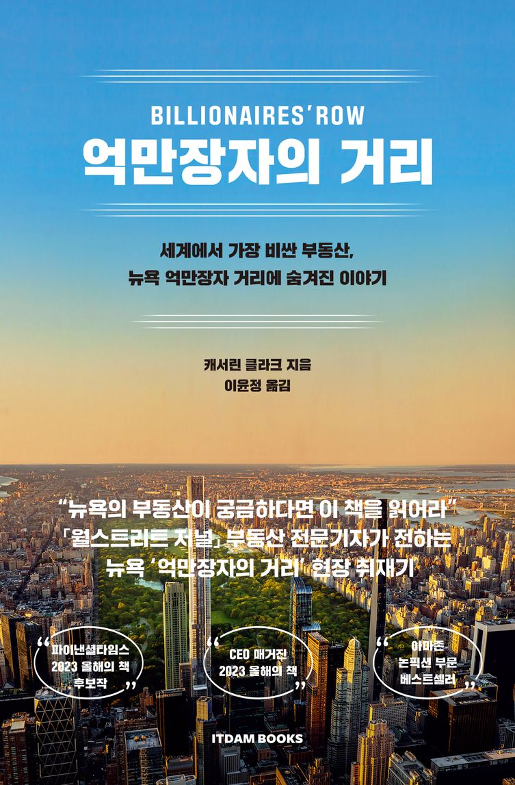 억만장자 켄 그리핀, 빌 애크먼, 마이클 델, 인기 가수이자 영화배우 제니퍼 로페즈… 이름만 들어도 알 만한 유명인과 억만장자가 모여 사는 동네가 있다. 전 세계에서 가장 비싼 부동산이라는 미국 뉴욕 맨해튼에서도 센트럴파크 인근 ‘억만장자의 거리’는 끊임없이 사람들의 궁금증을 자아내는 곳이다. 얇고 높은 저 건물은 무슨 건물일까? 그곳에 사는 사람들은 누구일까? 그들은 얼마에 집을 사고팔았을까? 부동산 전문지 『리얼 딜』과「뉴욕 데일리 뉴스」, 「월스트리트 저널」에서 미국 부동산 시장을 전문적으로 취재해 온 저널리스트 캐서린 클라크는 2011년 뉴욕 부동산에 관한 기사를 쓰다가 ‘억만장자 거리’ 이야기에 매료되었고, 이 주제에 관해 1백여 명에 이르는 부동산업계 관계자를 취재한 끝에 『억만장자의 거리』를 펴냈다. 저자는 배짱 없이는 발을 디딜 수 없는 세계에서 치열하게 경쟁하는 뉴욕 부동산 거물(개리 바넷, 해리 맥클로우, 스티븐 로스, 마이클 스턴)의 이야기를 시간순으로 기록하고, 그들이 지은 다섯 건물(원 57, 432 파크 애비뉴, 111 웨스트 57번가, 센트럴파크 타워, 220 센트럴파크 사우스)에 집중해 소개한다. 이 책은 억만장자 거리 이면에 숨겨진 이야기를 생생히 전해 뉴욕 부동산의 세계로 독자를 안내했다는 평을 받으며, 2023년 「파이낸셜타임스」 올해의 비즈니스 도서상 최종 후보작과 2023년 『CEO 매거진』 올해의 책으로 선정되었고, 아마존 논픽션 부문 베스트셀러 순위에 오르며 대중과 언론의 주목을 받았다.