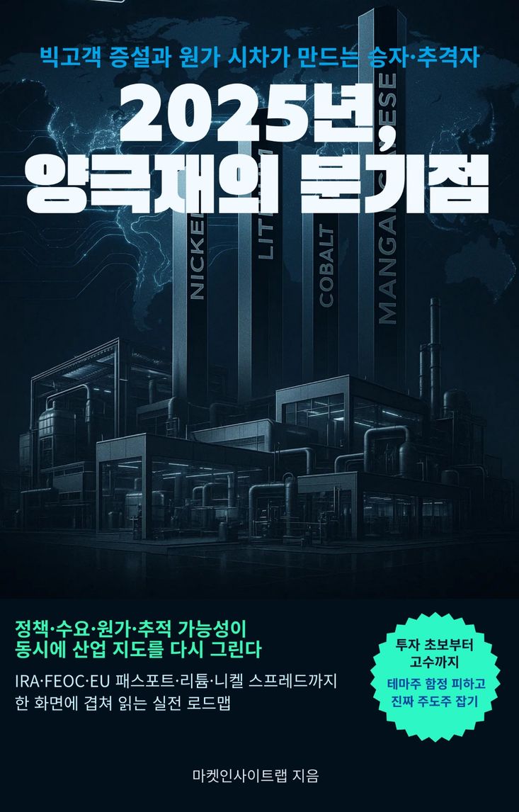 양극재 산업의 승패는 가격을 맞히는 데서 결정되지 않는다. 리튬과 니켈의 지표가 어떻게 움직이는지는 누구나 볼 수 있지만, 그 가격이 계약식과 재고, 공정 리드타임을 거치며 실제 손익으로 전달되는 과정은 회사마다 전혀 다르다. 같은 톤의 양극재를 팔아도 어떤 회사는 금속 가격 급락기에 재고평가손실을 크게 기록하고, 어떤 회사는 지표 하락을 이용해 가공 스프레드를 지켜 낸다. 차이는 재고를 얼마나 짧게 돌리는지, 금속 제외 매출과 스프레드를 어떻게 관리하는지, 헤지와 환율, 계약 조항을 얼마나 정밀하게 설계해 두었는지에서 나온다. 여기에 북미의 세액공제와 FEOC 규정, 유럽의 배터리 패스포트와 탄소 문턱 같은 정책 변수까지 겹치면, 단순히 CAPA 숫자나 생산 톤만 보고는 어느 기업이 진짜 승자인지 판단할 수 없다. 그래서 투자자는 한 해의 평균 실적이 아니라 어느 분기에 어떤 사건이 겹쳤는지, 수요와 화학 믹스, 금속 가격과 프리미엄, 규제와 관세, 안전 규정과 원산지 요건이 서로 어떤 타이밍으로 충돌하는지를 달력 위에 그려 봐야 한다. 이 책은 양극재 산업을 그런 달력의 언어로 다시 설명하면서, 투자자가 스스로 각 기업의 사업모델을 해석하고 자신만의 시나리오를 세울 수 있도록 돕는다.