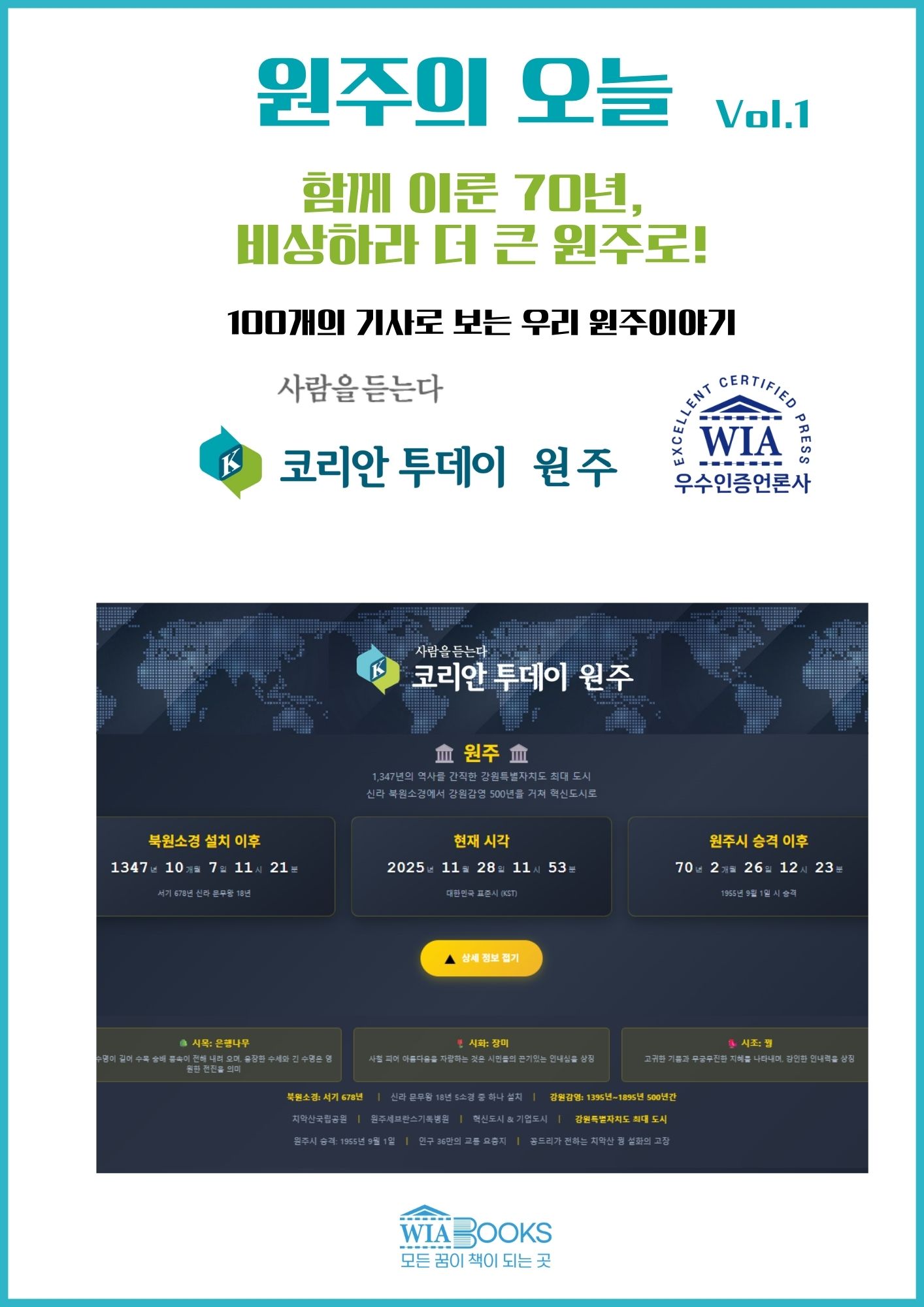 이 책 《원주의 오늘 Vol.1》에 담긴 100개의 기사가 바로 이렇습니다. 빠르게 소비되는 뉴스가 아니라, 시간이 지나도 의미를 잃지 않는 기록들. 원주라는 도시가 어떻게 과거를 기억하고, 현재를 살아가며, 미래를 준비하는지를 담담하게 전합니다.