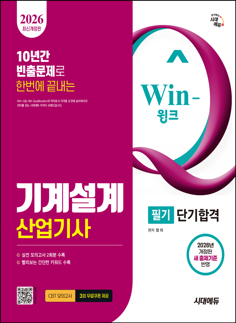 기사ㆍ산업기사 시험은 만점을 목표로 하는 시험이 아니라 평균 60점 이상을 받아 합격하는 것에 의의가 있다. 그래서 핵심만을 간추려 시험에 꼭 나오는 부분만 중점적으로 공부할 수 있도록 제시하는 것이 합리적이고 계획적인 수험서가 갖추어야 할 조건이라고 할 수 있다. 그런 점에서 Win-Q 기계설계산업기사는 그 조건에 정확히 부합한다.