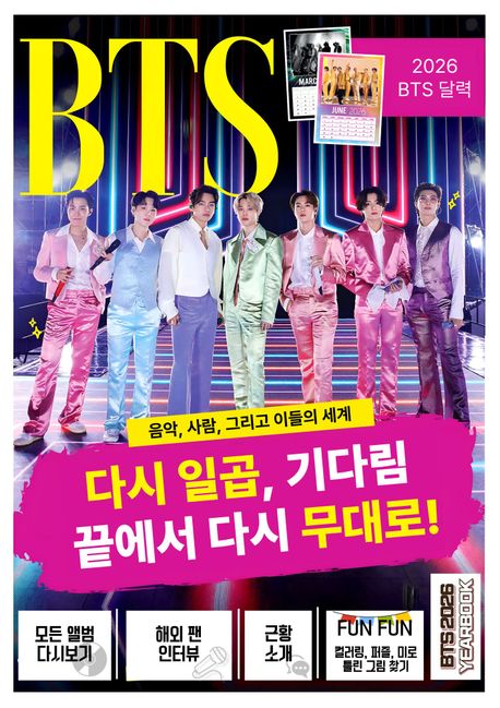 또한 해외 팬 인터뷰, BTS의 치유와 위로의 가사 분석, 역대급 글로벌 콜라보레이션 정리, 앨범 히스토리까지 더해져 음악·메시지·문화적 영향력을 입체적으로 조명합니다. 여기에 2026 BTS 달력, 컬러링 페이지, 틀린 그림 찾기와 미로 게임 같은 참여형 콘텐츠까지 수록되어, 읽는 즐거움과 소장 가치를 모두 만족시킵니다.