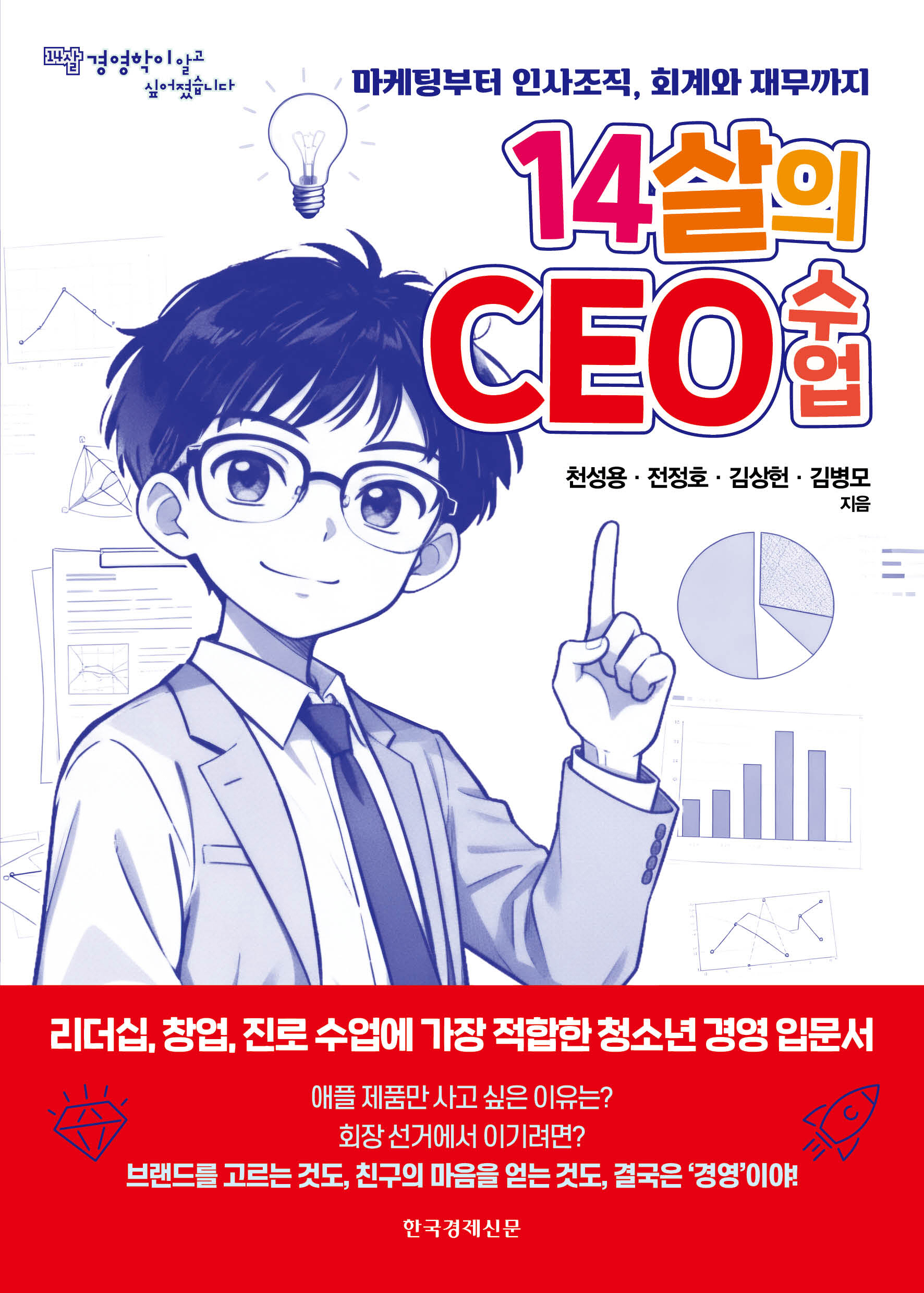 《14살의 CEO 수업》은 중학교 1학년인 오바른과 나대로 두 친구가 경영학부 교수들을 만나며 ‘경영학’이라는 세계를 직접 체험하고 이해해가는 과정을 그린 청소년 경영 입문서이다. 경영학은 보통 어른들이나 기업에서 필요로 하는 학문이라고 여겨지지만, 저자들은 경영학이 청소년들의 일상에도 깊숙이 연결되어 있다고 강조한다. 친구와의 관계에서 선택을 얻어야 할 때, 학급 활동에서 협력과 갈등을 조율해야 할 때, 앞으로 자신의 진로를 설계할 때까지, 결국 ‘사람의 마음을 얻고’, ‘주어진 자원을 효율적으로 쓰며’, ‘현명한 선택을 하는 힘’이 필요하기 때문이다. 이 책은 경영학을 처음 접하는 청소년을 위해 어렵고 추상적인 개념을 대화와 사례 중심의 이야기 방식으로 풀어내어 쉽게 이해할 수 있게 구성되어 있다.