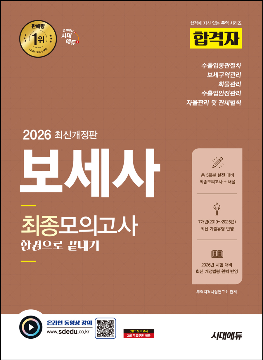 이에 출판문화를 선도하는 시대에듀에서는 보세사 전문자격시험을 완벽하게 대비하기 위해서 새롭게 〈보세사 최종모의고사〉를 출간하게 되었습니다. 최근 보세사 자격시험은 단순한 법령 암기에서 벗어나 사례를 응용하는 방식 등 그 난도가 날로 높아지고 있습니다. 본서에서는 이러한 출제경향을 면밀히 분석하여 실제 시험에 출제될 만한 이론들을 엄선하고, 실제 시험과 같은 구성의 최종모의고사 5회분을 수록하였습니다.