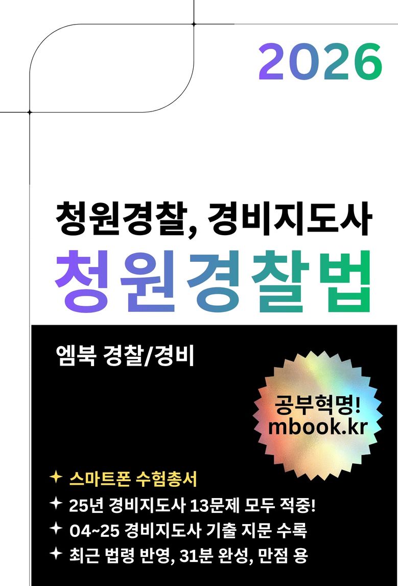 본 교재는 청원경찰법, 시행령, 시행규칙, 별표와 22년간(2004년~2025년)간 경비지도사 기출문제를 종합 정리하여 시험 문제가 본 교재의 범위를 벗어나기 어렵고 본 교재를 활용하시면 만점이 가능합니다.