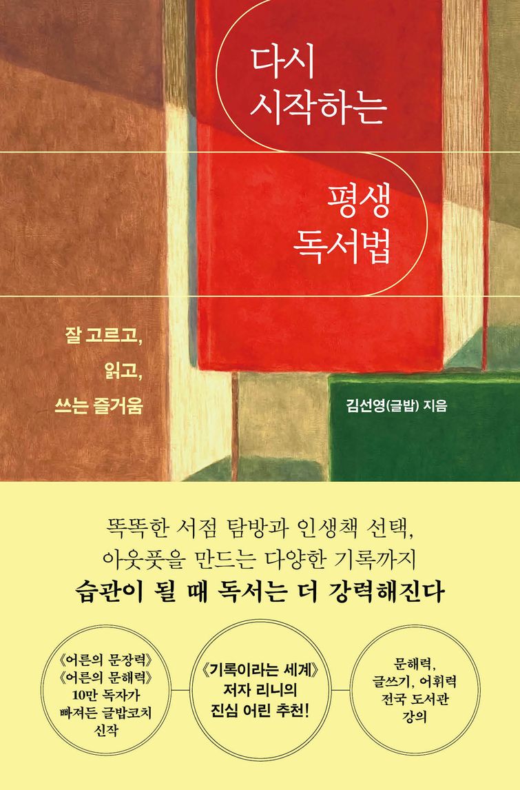 《어른의 문장력》과 《어른의 문해력》 등 10만 독자의 읽고 쓰기를 책임져온 김선영 작가는 신작 《다시 시작하는 평생 독서법》을 통해 근본적인 독서의 방법을 처음부터 다시 시작하자고 제안한다. 책과 멀어진 이들이 다시 책과 가까워질 수 있도록, 베스트셀러 작가이자 오랜 독서가의 노하우를 아낌없이 쏟아부었다. 그래서 이름도 ‘평생 독서법’이다.