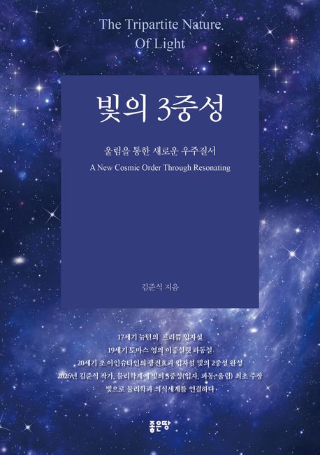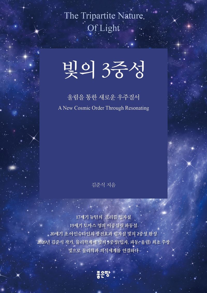2026년, 빛의 3중성으로 지난 세기를 넘어 새로운 빛의 속성을 주장하게 되었다. 그것은 입자, 파동, 울림이다. 저자는 빛의 3중성으로 ‘나’와 ‘우주’를 연결하고 있으며, 빛이 존재의 근원이자 생명의 완성이라고 주장한다. 또 저자는 빛의 이중성으로는 우주를 온전히 설명할 수 없다고 보고 있으며, 입자와 파동의 해석만으로는 우주의 몸을 담을 수 없다고 본다.