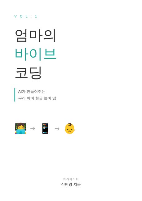 "이 책은 100만 원의 실패 비용을 치르고 찾아낸, 주말 하루 만에 끝내는 엄마표 앱 만들기의 기록입니다. 돈은 아끼고, 아이에게는 우리 엄마 최고! 소리를 듣는 가장 빠른 방법. AI가 만들어주는 우리 아이 한글 놀이 앱, 그거면 충분하지 않을까요?"
