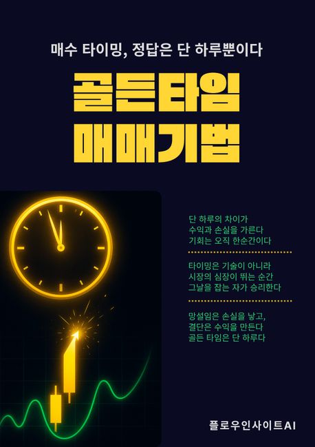 주식 투자에서 성공과 실패를 가르는 핵심은 매수 타이밍이며, 단 하루의 차이가 계좌의 운명을 바꿀 수 있습니다. 같은 종목을 사더라도 누군가는 상승 초기의 신호를 포착해 수익을 내지만, 하루 늦은 진입자는 손실을 경험합니다. 이 책은 ‘골든 타임’이라 불리는 단 하루의 결정적 매수 순간에 집중합니다. 세력의 자금 유입, 거래량 급증, 외국인·기관 수급 전환, 호가창의 급격한 변화 등 시장의 신호등이 동시에 켜지는 시점을 공략해야만 큰 수익을 낼 수 있다는 점을 강조합니다. 분할 매수로 평균 단가를 맞추는 전략이 아니라, 확실한 순간에 집중 투자하는 것이 핵심입니다. 또한 상한가 다음 날, 상승 초입, 갭상승 종목 등 다양한 골든 타임 패턴과 시간대별 수급 반응, RSI·MACD 같은 보조 지표 활용법, 조건검색식으로 신호를 잡는 방법까지 구체적으로 다룹니다. 결국 매매의 성패는 기술이 아니라 타이밍이며, 준비된 투자자가 그 하루를 기다렸다가 행동할 때 시장은 보상으로 큰 수익을 제공합니다.