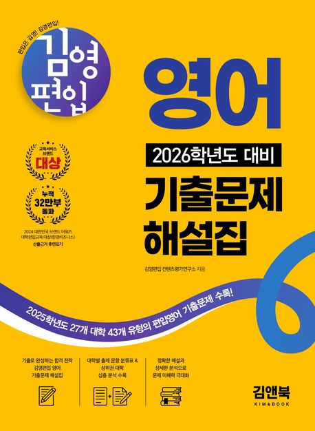 <김영편입 영어 2026학년도 대비 기출문제 해설집>에는 2025학년도에 출제된 27개 대학 43개 유형의 영어 기출문제가 수록되었습니다. 김영편입 영어 해설집은 편입 수험생들이 2025학년도 편입 영어 시험의 출제 경향과 난이도를 파악하고 실전 시험에 대비할 수 있도록 구성되었습니다. 지문 해석뿐만 아니라 선택지 해석, 수록된 어휘, 문제 풀이 분석 및 오답에 대한 설명을 제공하여, 수험생들이 혼자서도 쉽게 기출문제를 이해할 수 있도록 했습니다.