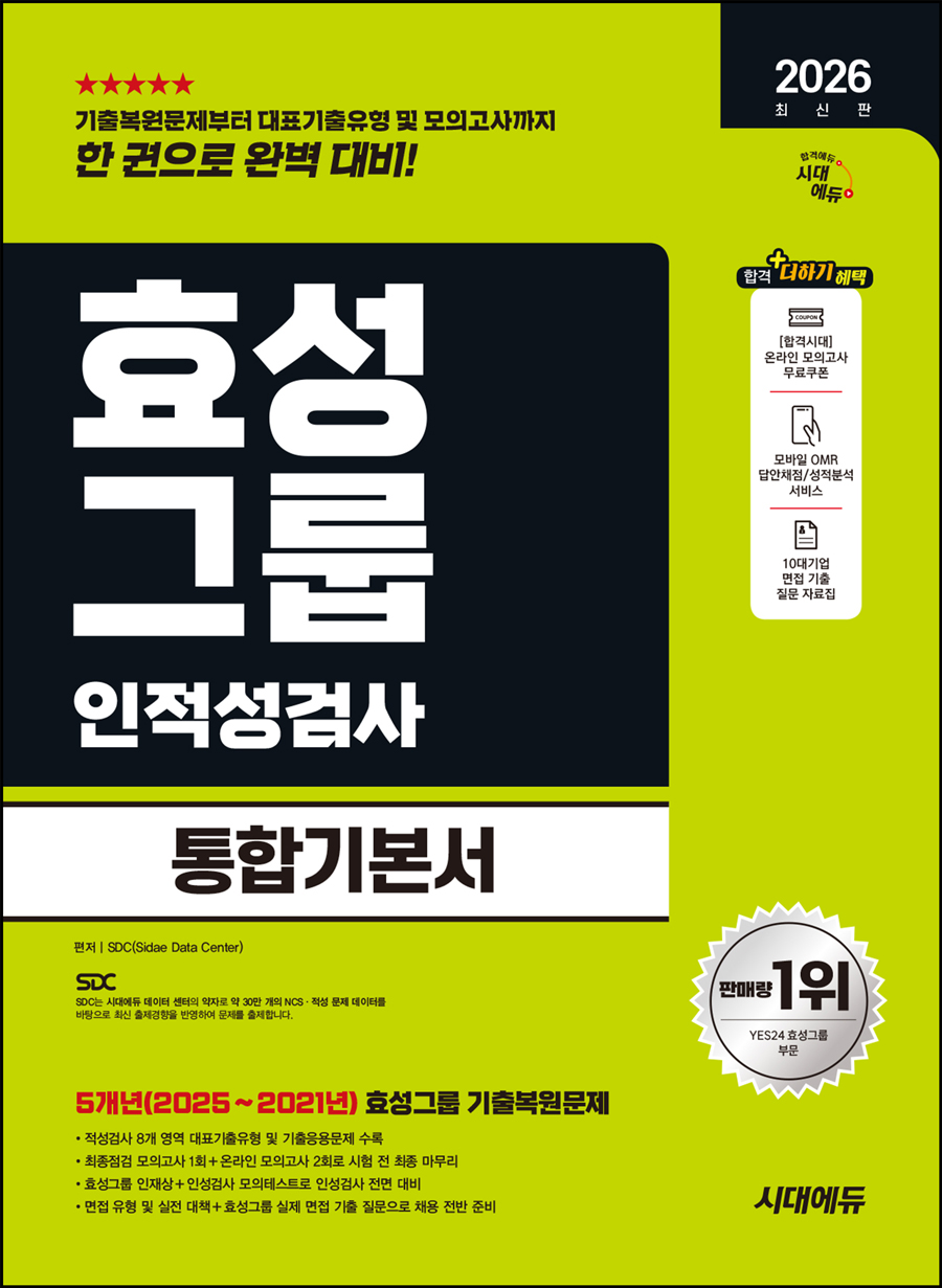 시대에듀는 효성그룹에 입사하고자 하는 수험생들에게 좋은 길잡이가 되어주고자 『2026 최신판 시대에듀 효성그룹 인적성검사 통합기본서』를 출간하였다. 최신 5개년 기출복원문제를 수록하여 최근 출제경향을 파악할 수 있도록 하였고, 8개 영역의 대표기출유형 및 기출응용문제를 통해 체계적인 학습이 되도록 하였다. 또한 최종점검 모의고사 1회와 온라인 모의고사 2회로 실전과 같은 마무리 연습을 할 수 있도록 했으며, 인성검사와 효성그룹 실제 면접 기출 질문으로 채용 전반을 준비할 수 있도록 구성했다.