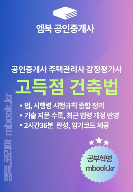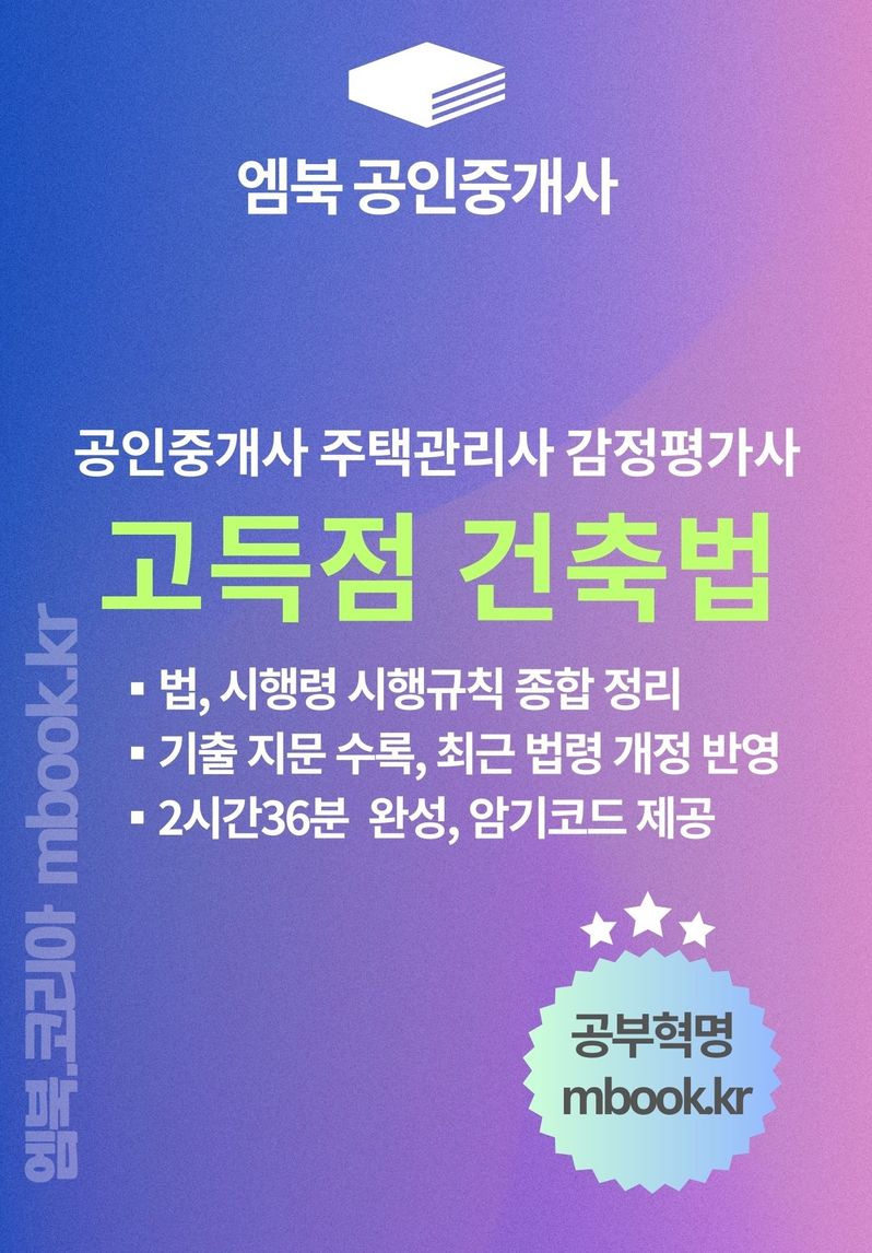 엠북 부동산공법 시리즈는 공인중개사 부동산공법에서 80~90점의 고득점을 가능하게 해 줄 것이며, 법률별로는 90점 이상, 100점도 가능합니다.
