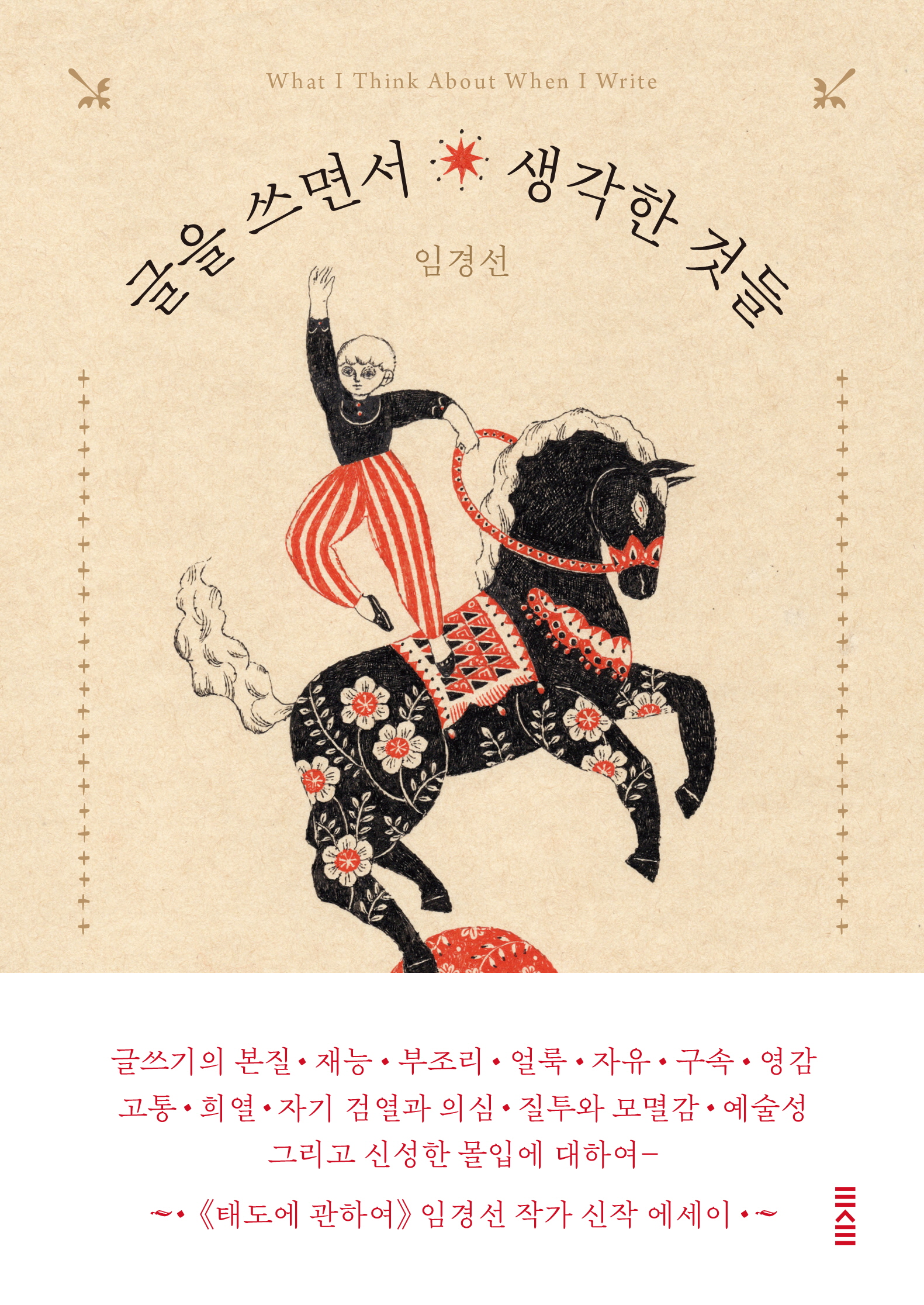 저자의 20만 부 스테디셀러 산문 《태도에 관하여》가 저자가 가장 중요하게 생각하는 ‘삶의 태도’를 담은 책이라면, 《글을 쓰면서 생각한 것들》은 저자가 가장 중요하게 생각하는 ‘글쓰기의 태도’에 대한 책이라고 할 수 있다. 이 책 어디에도 흔히 접할 법한 위로나 응원, 빈말 따위는 찾아볼 수 없다. 솔직하고 담백하며 건조한 이 책을 읽다 보면 조금 쓰리거나 아플 수도 있다. 하지만 그것은 겉핥기식 충고가 아닌 오로지 ‘보다 나은 글’을 함께 쓰자는 저자의 깊은 진심이다. 《글을 쓰면서 생각한 것들》의 표지 그림처럼, 글을 쓰는 사람들이란 하늘의 별을 붙잡아보려고 뛰어다니는 말 위에서 뒤뚱뒤뚱 아슬아슬하게 애쓰는 어릿광대가 아닐까?