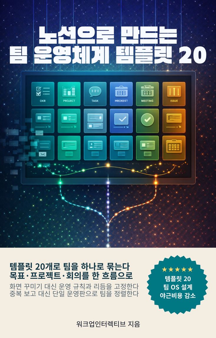 회의는 끝났는데 실행은 시작되지 않고, 문서는 쌓였는데 팀의 기억은 남지 않는다면 문제는 ‘도구’가 아니라 ‘운영체계’입니다. 노션을 쓰고도 계속 흔들리는 팀은 기준이 없고 연결이 없어서 같은 질문과 같은 논쟁을 반복합니다. 이 책은 그런 팀을 위해 목표·프로젝트·리스크·회의·사람이라는 핵심 영역을 20개의 템플릿으로 묶어, 합의된 규칙이 자동으로 반복되도록 설계합니다. OKR 허브와 KPI 스코어보드로 목표 해석을 통일하고, 프로젝트 홈과 태스크 인박스로 단일 진실의 원천을 만들며, 이슈·인시던트 트래커와 리스크 레지스터로 병목과 사고를 ‘미리 보이게’ 합니다. 회의록 데이터베이스, 아젠다 흐름, 결정 로그까지 연결되면 되돌림이 줄고 실행은 누락되지 않습니다. 온보딩·오프보딩과 위키·런북, 캘린더·폼·자동화, 거버넌스 루틴까지 포함해 팀이 커져도 느려지지 않는 운영을 완성합니다. 이제 ‘열심히’가 아니라 ‘굴러가게’ 만들 차례입니다. 이 책의 템플릿을 그대로 적용하는 순간, 팀의 시간은 보고가 아니라 결과로 돌아옵니다.