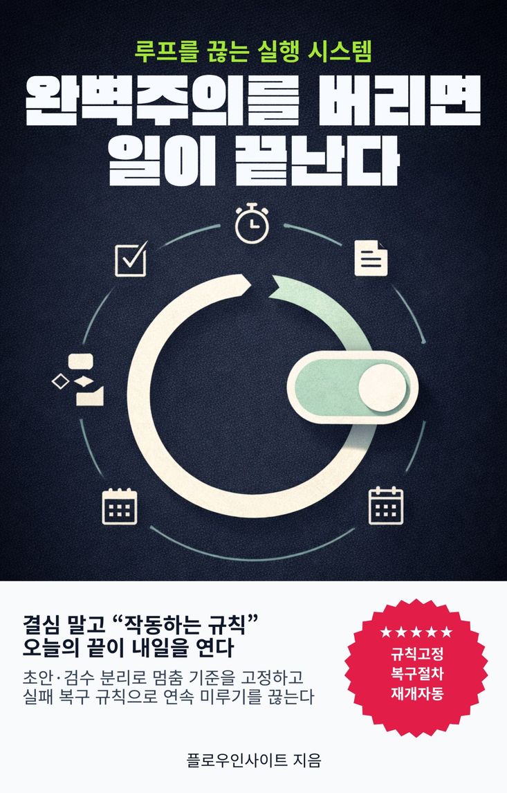 완벽주의를 없애려 하지 말고, 일을 끝내는 쪽으로 쓰자. 이 책의 규칙들은 단순하지만, 단순하기 때문에 반복되고, 반복되기 때문에 결과가 남는다. 오늘 한 번의 작은 완료가 내일의 시작을 가볍게 만든다. 이제 ‘완벽해야 시작할 수 있다’는 규칙을 버리고, ‘작게라도 끝내면 다음이 열린다’는 규칙으로 바꿔보자.