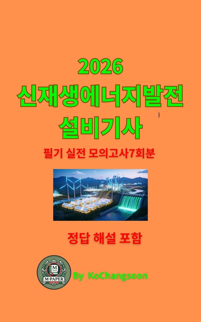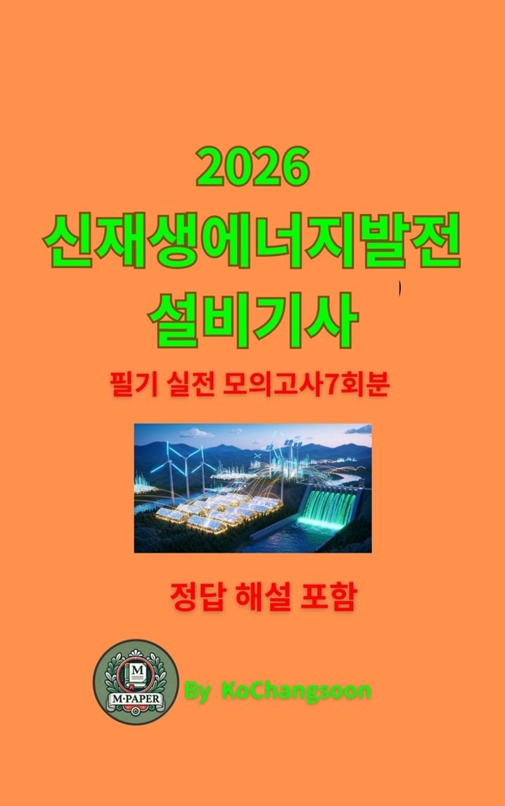 본서는 2026년 CBT 시험에 완벽 대응하도록 최신 출제 경향을 반영하여 제작한 **신재생에너지발전설비기사 필기 실전 모의고사 7회분(총 700문항)**이다. 태양광·풍력·연료전지·에너지저장장치(ESS)·전력계통·신재생 관계법규 전 영역을 체계적으로 반영하였다. 각 문항은 실제 시험 난이도에 맞춰 구성되었으며, 모든 문제에 정답 + 4줄 핵심 해설을 수록하여 학습 효율을 극대화하였다. 실전 감각 향상과 약점 보완을 동시에 달성할 수 있는 최적의 합격서이다.