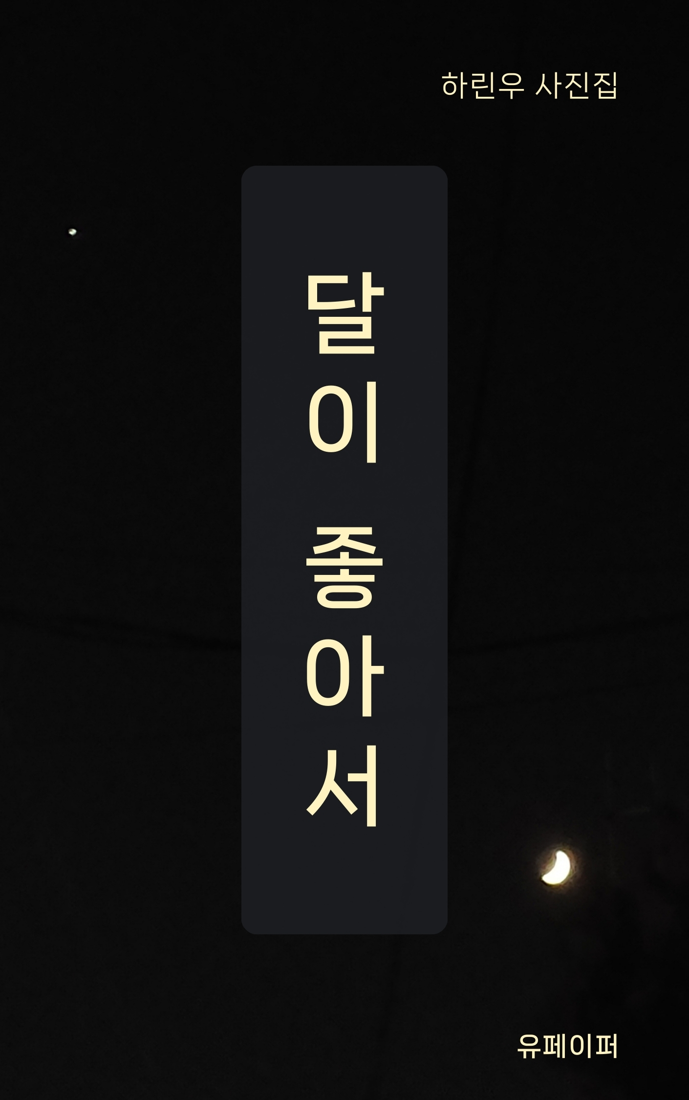 어떤 날은 달을 보며 엉뚱한 상상력을 발휘해 보기도 했고, 어떤 날은 애써 하루를 버텨내고 있는 고단한 마음을 달에게 일러바치듯 말을 건네기도 했습니다. 때로는 곁에 없는, 혹은 세상 어딘가에 존재하지 않을 누군가에게 건네는 혼잣말이나 닿지 않을 대화, 그리고 이름 모를 누군가에게 보내는 막연한 위로들을 사진의 제목과 짧은 글의 형태로 띄워 보냈습니다.